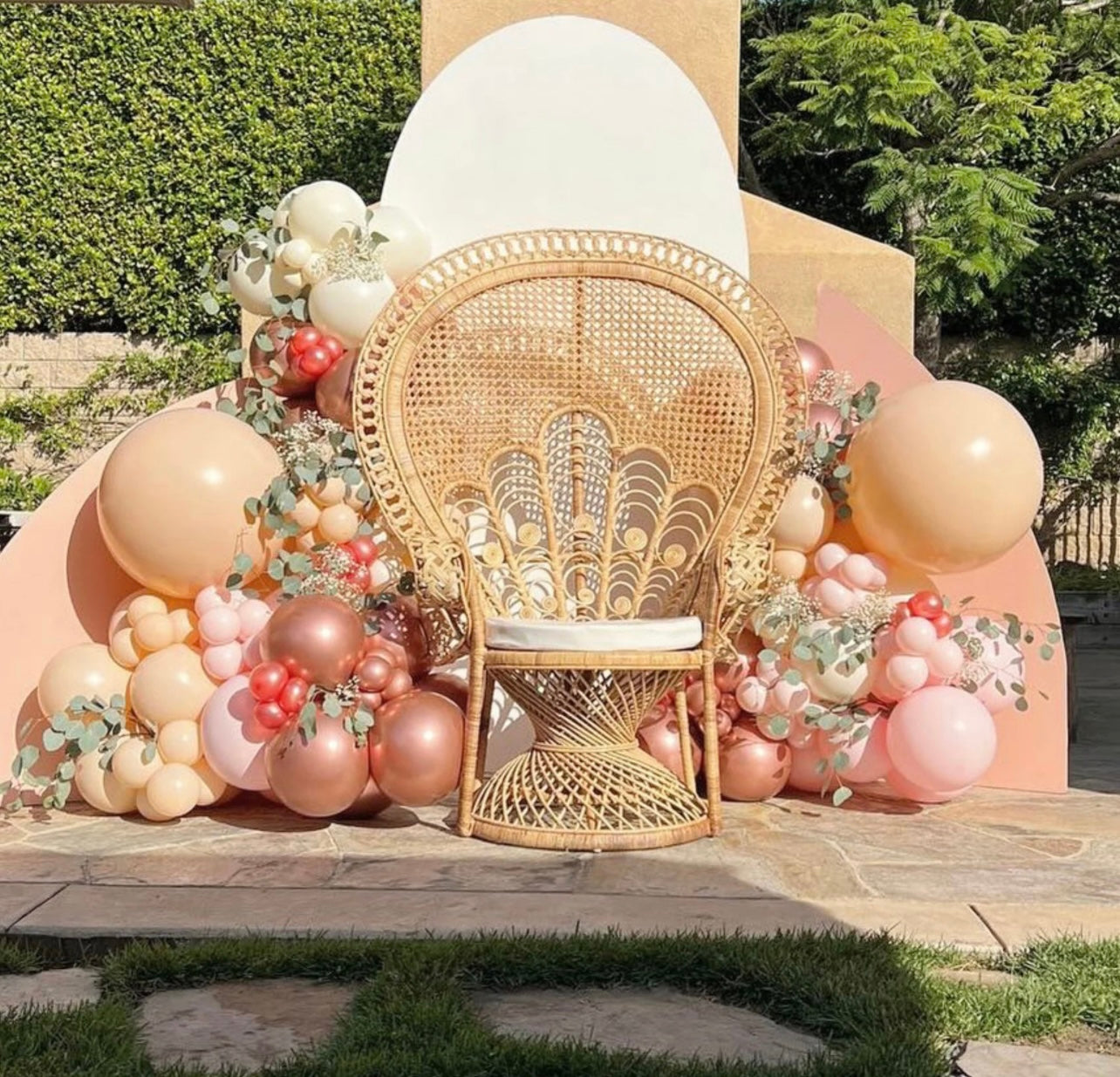 Elevate your event decor with a vibrant arrangement featuring stylishly colored balloons paired with a striking bright peacock chair backdrop. This combination creates a visually captivating focal point, perfect for photo opportunities and enhancing the ambiance with expert-level design flair. Ideal for celebrations seeking a bold yet elegant statement.